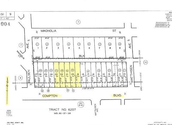 1st time on market since forever. 5 adjacent 30 X 168+ lots, all street-to-alley, 25,275 sqft of land (0.58 acre). CL zoning allows 75' height limit and myriad of uses (see list and spec's in Supplements) including live/work units, SFR's & multi-unit residential with 1500 sqft of land per unit (which should make this a 16 unit lot). $110K per lot, $21 a foot. 150' of street frontage and 150' of alley frontage, 70 walk score: 3 blocks west of Civic Center, Courthouse, Sheriff HQ & public library, and walkable to Victory Park and all three schools. Compton is finally making a comeback; crime is way down, chain stores are moving in, and the new mayor is a rising political star. The other APN's are: 6151-009-058, 6151-009-059, 6151-009-063, 6151-009-064 & 6151-009-066 (6 total). Zillow predicts 6.3% appreciation here next year.