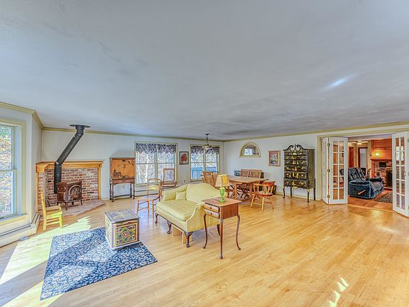 Spacious, light filled home in the heart of the White Mountains on 10 acres. Two minutes from I-93/downtown Franconia, up Wallace Hill Road to this multi level woodland home. Be at the slopes for 'first tracks' within minutes. The exterior delights with quintessential rock walls, stone pathway, colorful perennials, covered entry porch & large, open decks amongst the trees. Enter into a 24'X26' gathering room complete with hardwood floors and brick hearth with woodstove; this 'airy' space welcomes the sun on 3 sides. Through the French Doors to the efficient kitchen with its own dining space and direct access to 12'X37' deck overlooking your own forest. Adjacent to the kitchen space is the 'keeping room' with a wood burning fireplace for cozy times after a day of skiing at Cannon. First level boasts a full bath / laundry and two bedrooms just down the hall. Upstairs find 2 more bedrooms at either end of the building with full bath. The primary suite encompasses the southerly end of the house with ample bedroom space, walk in closet and potential office space -- here you find the sliding door access to the upper balcony. 'Bonus' finished room in walkout basement has great natural light & is easily accessed via the 2 car garage. Well loved, this 4 bedroom, 2 bath home had a recent roof replacement & exterior paint. Come & make this property your own. So much potential for your own trails; cut some trees for a westerly vista. Cannon / Franconia Notch just 15 mins away.