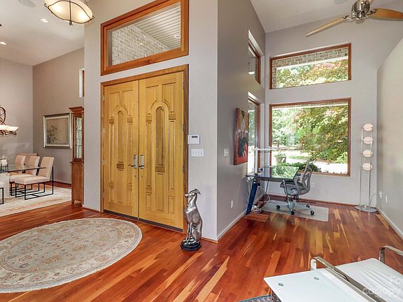 The private 1.56-acre waterfront faces west, offering stunning views of Lingle Lake and a partially fenced yard. The spacious home is remarkable with 5 bedrooms and 4.5 baths with over 4500 sf of luxurious living, loaded with windows for natural light. The fabulous open floor plan features a two-story great room w a fireplace, Brazilian cherry wood floors, a rear deck, and a covered porch. Gourmet kitchen w/ granite countertops, stainless steel appliances boast a Wolf gas range and a new subzero built-in refrigerator, new range hood. Main level primary suite w/ a jetted tub, steam shower, dual shower heads, and heated tile floor. The laundry room is on the main level and has built-ins for ample storage, a work desk, and a laundry sink. The upper level has office w/ built-ins. Finished lower level with a den and a wet bar, half bath a lower level patio, and extra storage. The four-car garage has parking for 6 cars & a 220-volt EV line. Home Warranty. Solar Panels. This is a must-see.