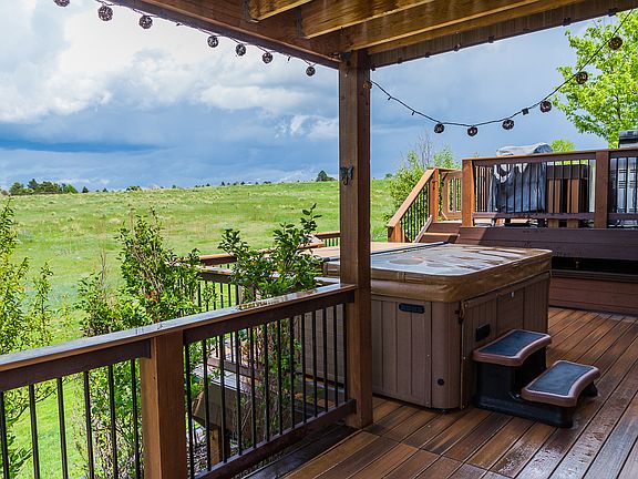 Amazing home in desired Pinery community with rustic mountain contemporary style nestled in the middle of mature trees and backing to an open space with beautiful scenery! This home features a stunning kitchen, wood floors, 3 spacious bedrooms and 2 full baths on upper level with a deck off the master, another cozy bedroom with a full bath, steam shower and cedar walk-in closet in the walk-out basement along with a work shop / "man cave". Speaker system, new furnace & water heater, newer windows, a huge composite deck with a hot tub, wired gas fire pit & gas grill.