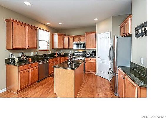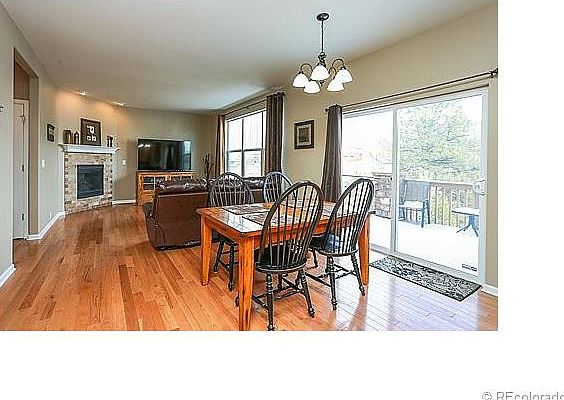 This upgraded home is barely lived in and backs up to open space! Extended hardwood floors from entry into family room with gas fireplace and views of the open space. Good sized kitchen has staggered maple cabinets with crown molding and pull out shelves, plus slab granite countertops and a prep island. The stainless steel appliances include gas range with double ovens, microwave and dishwasher and there is a corner pantry. The dining area has access to the elevated no maintenance deck with stone columns. Master bedroom includes private 3/4 bath with oversized shower and dual sinks plus walk-in closet. Secondary bedrooms share a full hall bath and the laundry room is conveniently located upstairs. Walk-out basement has been partially finished with a half bath and there is a tankless water heater. Three car garage, located in the Cherry Creek School district in a pool community, close to shopping and restaurants