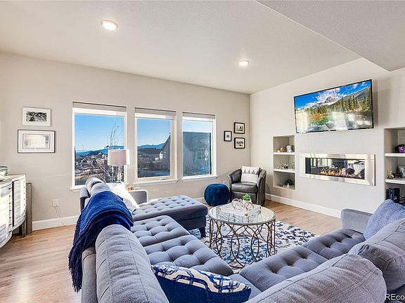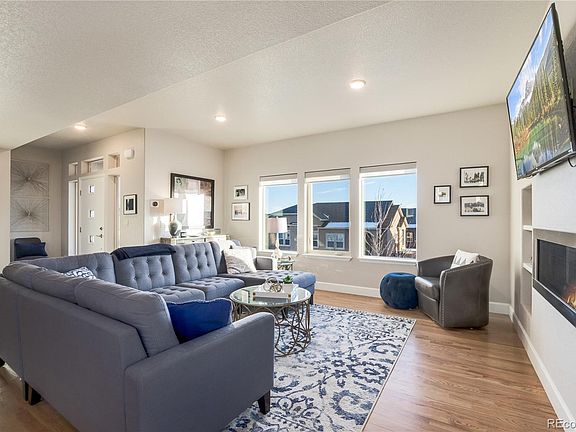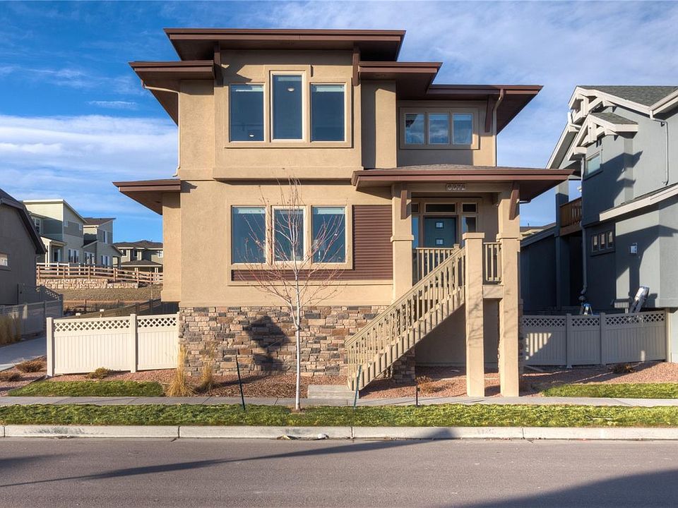 "The Jewel of the Vanguard Collection". This incredible home with stunning views is one you won't want to miss. Step inside to find an exquisite home, with all your wish list items including double stained custom hardwood wood floors, custom staircase and beautiful fire place. No detail has been overlooked in the kitchen with huge kitchen island, stainless steel appliances and a custom backsplash. Upstairs, you will find a total of 3 bedrooms with stunning views of Cheyenne Mountain from your master bedroom. Fully finished basement features a wet bar, rec room, bedroom and additional bathroom. This house has that "wow factor" you're looking for. Located in the heart of Wolf Creek Ranch and feeding into the coveted D20 schools, it's in the perfect location near the fastest growing part of town. This is a low maintenance community where you won't have to shovel your driveway nor mow your lawn - it's all taken care of for you.