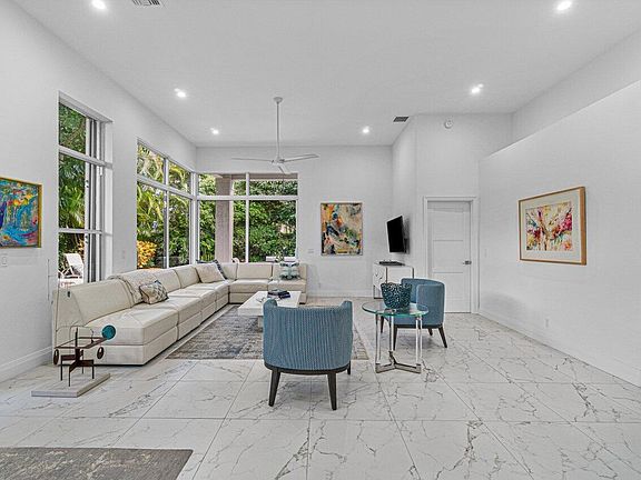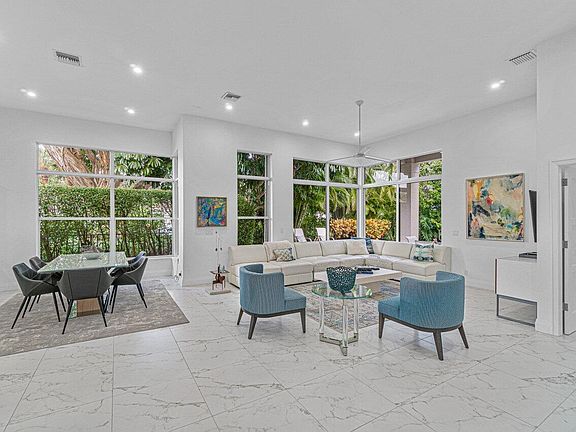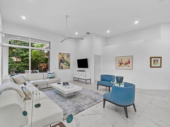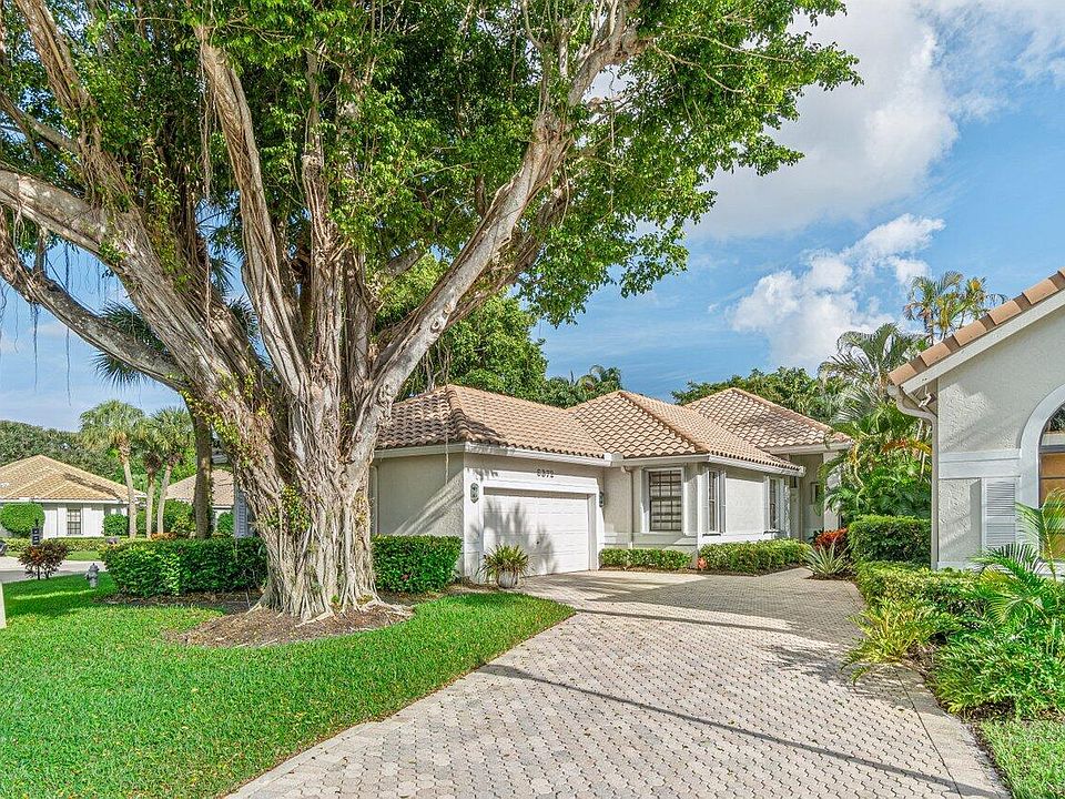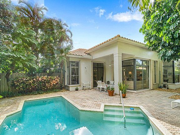 This absolutely charming property offers a tropical private oasis in your own backyard. You will be impressed upon entering the open concept living room of this modern renovated home that feels very spacious and bright. An oversized eat-in kitchen offers tons of storage and is perfect for entertaining with the large peninsula island that flows seamlessly to the dining room. The primary bedroom is large in scale and includes a separate water closet, dual sinks, a spa-like shower, and immense closet space. The second bedroom is outfitted for the dual purpose of an office/den and perfectly fits a sleeper sofa for guests. The third bedroom is en-suite with its own private bathroom and is large enough to accommodate a king bed. The covered outdoor area is perfect to enjoy the lush tropical backdrop around the patio and pool. A few of the numerous upgrades to this lovely home include a new generator, a newer roof in 2017, and accordion hurricane shutters. Located in the award-winning Broken Sound Country Club. Broken Sound boasts two championship golf courses that are certified by Audubon International, 23 Har-Tru tennis courts, a pro shop, dining options, a two-acre poolscape with bistro, a 38,000 SF spa and wellness center, steam rooms, hot tub, treatment rooms, a child/tween game room, and a myriad of events for all.