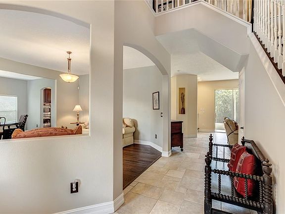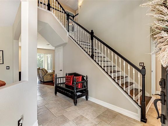 Welcome to Stoneybrook Hills, Mount Dora's sought after gated community! This Distinctive home is situated on a cul-de-sac, over 1/3-acre lot & no rear neighbors!! Freshly painted exterior invites you to covered porch & into the tiled entry foyer w/striking staircase. New Bamboo floors flow throughout. Main floor features living rm, dining rm, family rm, laundry rm, guest bedroom & bath. Family rm w/gas fireplace has doors to expansive screened porch. Kitchen features wet bar, built in desk, double pantry, GE Profile stainless appliances, built in ovens, corian countertops, tile backsplash, center island & eat in area w/doors leading to screened porch. Upstairs offers versatile 500+/- Sq. foot family/game/theatre room, 3 guest bedrooms & guest bath. Master Suite has tray ceiling, sitting area & two walk in closets. Master bath has double vanities, jetted tub & walk in shower. Master suite & 2 guest bedrooms have French doors leading to screened porch. Patio screens replaced 2017, new Oil Rubbed Bronze door handles, sink & lighting fixtures, ceiling fans in every bedroom, security & closed circuit camera system, Pre wired Network System Cat5/6 in all rooms. No direct rear neighbors as home backs up to conservation/retention land. Family-friendly community features clubhouse, heated swimming pool, fitness center, basketball court, 4 court tennis courts & playground. Conveniently located close to all amenities, minutes to Historic Mount Dora. Easy commute to Orlando airport, attractions & 429 expressway.