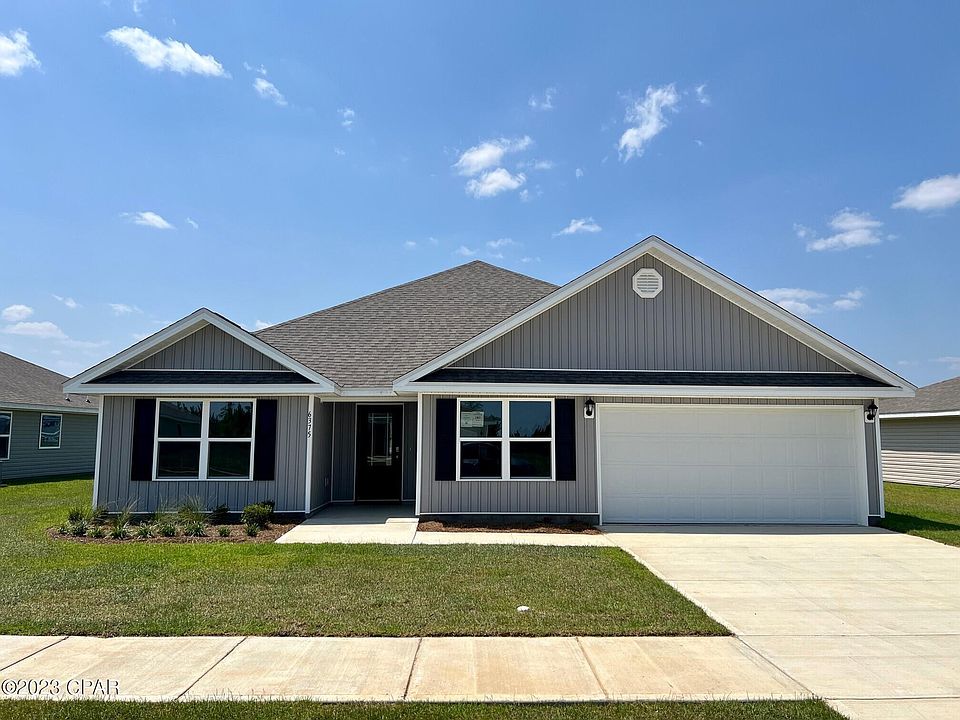 When you enter the Sawyer floorplan through the beautiful prairie door, you are amazed at the brightness and width of the entry way into this 5-bedroom, 3 bath, 2,483 square foot home. With 2 spacious bedrooms off the main entry way separated by a full bathroom and another secondary bedroom across the entry way on the opposite side, your guests and children are afforded privacy at the front of the home. Walk a few steps beyond and enter the open family room with a large area for an office or formal dining room. Overlooked by the huge kitchen island with a spacious breakfast area to the side. The kitchen features a walk-in pantry, beautiful white cabinets, and laminate countertops. The primary bedroom and bathroom are located off the back of the home featuring lush carpet flooring in the bedroom and luxury vinyl plank in the bathroom. The bathroom offers a soaking tub, large shower, double sinks, and a large closet. The covered back porch is sizeable, private, and is designed for easy in screening. The fifth bedroom and bath are located off the back of the home. This 4 sides vinyl home is situated on a large lot, sodded on 4 sides, located amidst beautiful trees, ponds, and fountains.