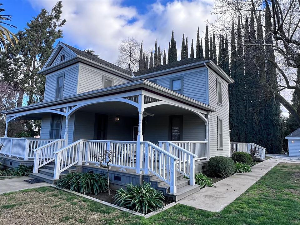 A MUST SEE! Homestead Victorian home built in 1901 situated in the beautiful town of Laton. This piece of history boasts 5 bedrooms 2 1/2 bath with over 2000 ft. of living space, a 5 car garage with his & her's parking divided by a car port. Parking garage is over 1800 ft. that also features plenty of storage space and custom cabinets. This home welcomes you with an over sized front porch, white Wickert patio set to accommodate your guests. The 36 solar panels which are owned, adds to the great amenities that this home has to offer. This Homestead Victorian, is indeed a setback in time, as you explore the intricate Craftsmanship and detail of this one of a kind home. This property seamlessly blends historical charm with modern comfort, the orient pine woodwork, stain glass windows with great artistry and detailed. This indeed is a period that transports you to the elegance of a bygone era enjoy the spacious yard that's over 19,000 square feet of landscaping mature trees and custom cement work for RV parking or additional parking to accommodate your guests. The semi wraparound porch gives this home character and charm, which will be greatly appreciated by your guest and family during your seasonal gatherings. This home is not just a residence. It's a piece of history, awaiting its next chapter. Schedule your visit today and experience the timeless allure of this Homestead Victorian gem. Bath count, and sq. ft. different than tax records, buyer to verify if important.