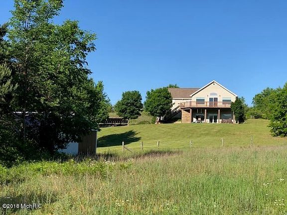 Spectacular country setting for this newer constructed, contemporary 4 bedroom, 3 full bath home on 10 acres just minutes west of Big Rapids and US 131 on a paved road. Custom home features open spacious floor plan, stainless kitchen appliances, maple floors & kitchen cabinetry, tile in entry & baths, master bedroom suite, large laundry-craft-sewing room, full finished basement, in-floor heat, central air, lots of large windows overlooking the stunning views of woods, open fields, rolling hills,beautiful sunsets, designated trout stream and a pond. Home also boats large decking, 2 car attached garage, 24x24 pole building with lean-to, outdoor wood boiler, and concrete drive. Close to Hungerford Lake, Manistee National Forest with hiking, horse trails and more.