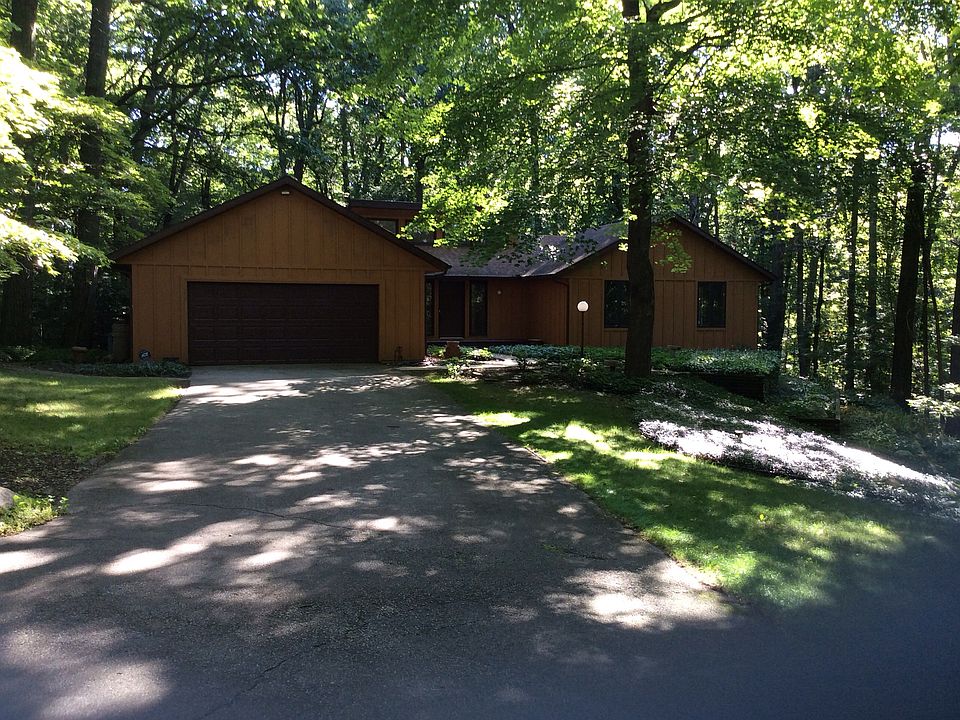 Private wooded 10 acre estate with breathtaking views from both levels. Sunken living room with fireplace. Kitchen open to huge dining area. Access the deck from Sunroom or Master bedroom. Walkout lower level is set up with a room for exercise equipment or would make a great hobby room. Plus a family/tv room with 2nd fireplace and a huge rec room with a wet bar and a dance floor. 2nd garage 20' X 24'. Sq. ft. and measurements not warranted. Taxes will be much lower with exemptions.