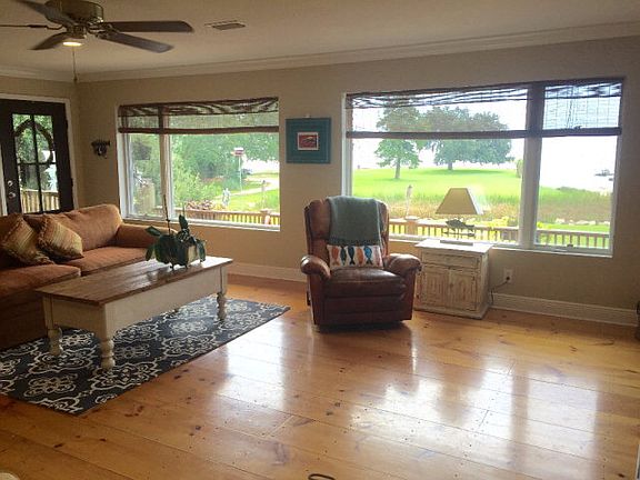 Entertainer's Dream with this waterfront 1 level 1560 sq ft house with pier. Watch breathtaking sunrises! Wide pine hardwood floors define the open concept: spacious Great Room with views of Mobile Bay, kitchen, & dining area with gas fireplace. Kitchen offers granite, stainless steel, gas range & white cabinetry. Split bedroom plan with sep. baths. Raised on pilings, house offers 4 covered bays for vehicles & boats; ext. Beach cargo lift; shed. Flat lot has canal running down South side. Close to Dog River Marina & Mobile Yacht Club, sailboats, regattas, and large bird population are enjoyed from porch. Front Lot (6379 Bay RD) is included with this property.