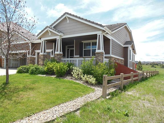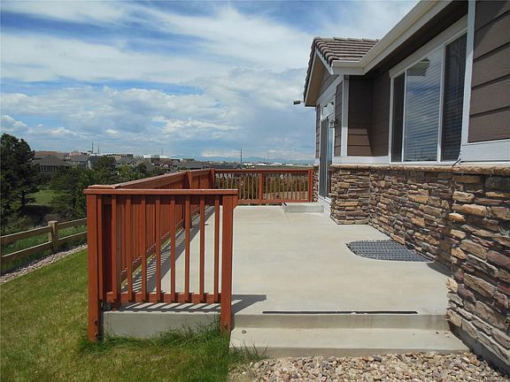 RANCH Home in The Wheatlands shows like a model with over $100K in upgrades by builder and owner! Backs to The Black Forest & Views of Mt. Evans! Hardwood floors, double doors to Study/Office with built-in shelves, expanded Dining Room, expanded 2nd and 3rd Bedrooms. Gourmet designer Kitchen with island and bar, SS appliances including double ovens, gas high-end cook top, side by side refrigerator/freezer, slab granite counters, designer back splash! Vaulted Great Room with ceiling fan, surround sound speakers installed, Tiled Gas Fireplace with blower. Custom blinds throughout. Master Suite has two(2) walk-in closets(His&Hers) and five piece bath. Finished basement features large rec room plus bedroom and large bathroom, plus 4 separate storage areas. Laundry room includes washer and dryer. 3 Car attached garage plus Concrete Tile Roof! Enjoy community clubhouse, 2 pools, many parks and trails to the lake. Cherry Creek School District and walk to three schools. Move-in ready!