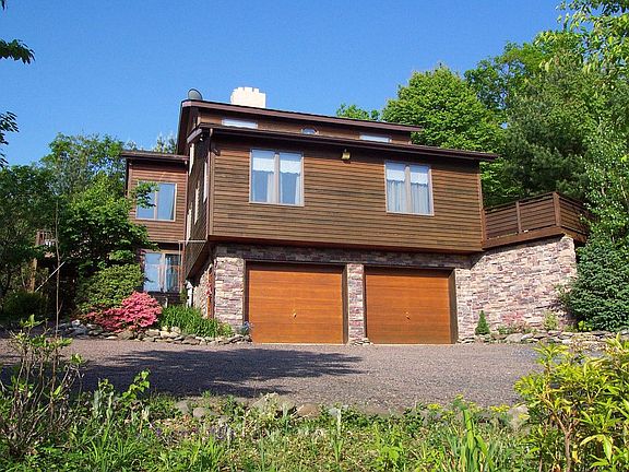 Unique, Captivating Beautiful, Tranquil Pocono Mountain Retreat designed by renown architect Rudy Hilt. Beauty and function flow perfectly together in this One of a kind multi level secluded hide away. This is a spectacular custom designed home with a million dollar view of the Delaware Water gap and Wind gap mountain range. This home is nestled peacefully in the middle of 2.8 lush acres. Minutes from Camelback Ski area, Mount Airy Lodge and route 80 and Rt. 33. Breathtaking views from all rooms and decks. Redwood and Mahogany decks surround this beautiful home. Enchantingly landscaped grounds with perennial gardens and wonderful organic vegetable garden. Large sunroom with glass and screens and hardwood floor. Relax or dine while enjoying nature at its finest. Skylights and many custom windows Two huge stone fireplaces. Hardwood oak and mahogany floors 2 1/2 Tiled baths Jacuzzi tub in master bath. Custom Chestnut stairway Custom kitchen cabinets Music room with grand piano could be converted to 5th bedroom. Fantastic views! Central air and Heat Cedar Siding with 2X 6 walls Standard Septic System 2- car garage Crestwood (wood barrel) pool. Direct solar south. Swim and enjoy therapeutic sunshine and views. This one of a kind 3000 square feet master piece nestled in the Pocono mountains is a must see to appreciate. Viewing to pre qualified buyers only. Have your pre-qualification letter or proof of funds ready to email before scheduling a showing HOME WARRANTY INCLUDED Thank You