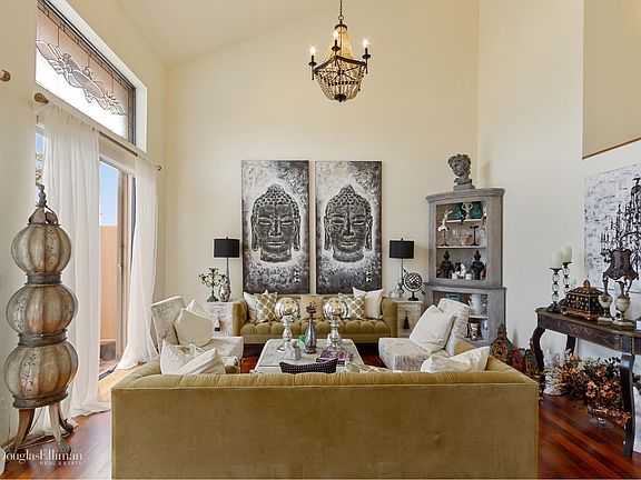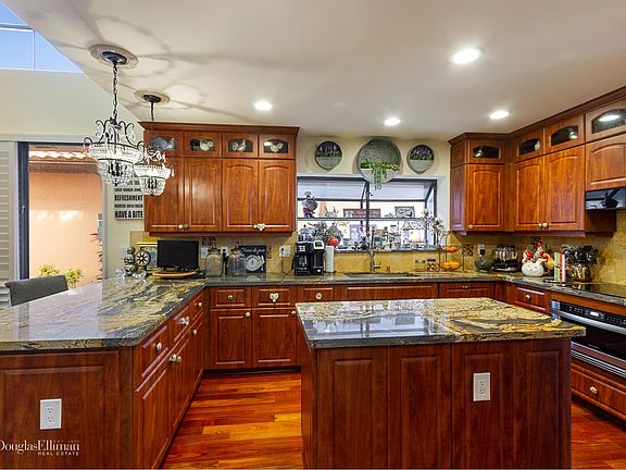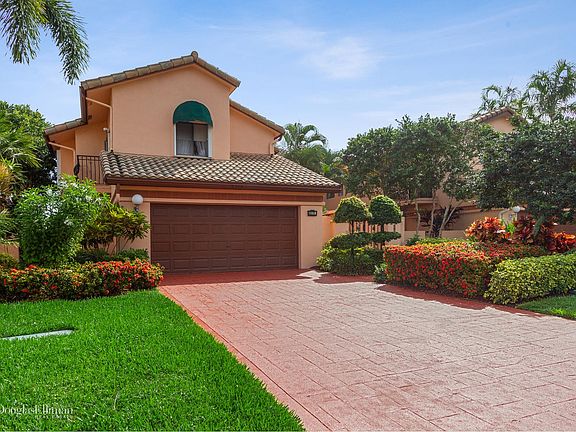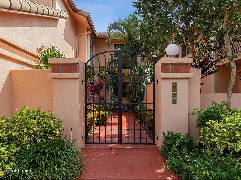 Through the gated entry of this Mediterranean inspired villa's terra-cotta tile pathway with lush tropical landscaping, you will find a true 4 Bedroom / 3 Bath where light & space have been maximized into an open-plan living area. Natural light spills into the home through sliding glass doors & etched clerestory windows and balanced with the warmth of rich wood flooring. Blending seamlessly into the surrounding dining / living areas the beautifully appointed kitchen has generous food preparation spaces, center island, real wood cabinets, granite counters, double-oven, built-in refrigerator and is perfect for serious cooking or quick snack. Step outside to a generous, landscaped terrace surrounding your enticingly blue swimming pool. Located on the lake & complete with a built-in BBQ