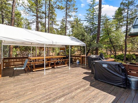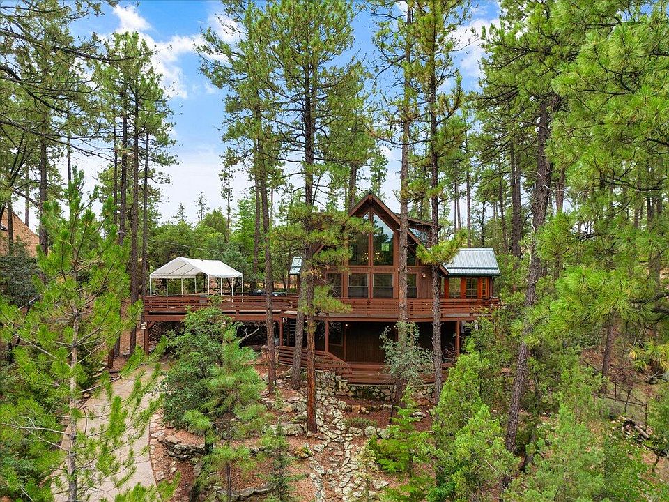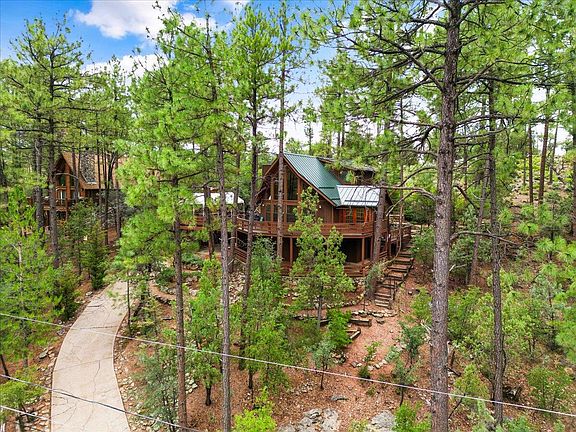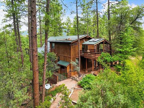 Discover a truly unique home that seamlessly blends elegance with a cozy cabin ambiance. Set against the stunning backdrop of the Tonto National Forest, this well-maintained property offers a move-in-ready escape. Entertain effortlessly with a finished basement, complete with its own kitchenette and bathroom. Multiple decks provide spectacular views of the Rim and Strawberry Mountain, ideal for gatherings and starlit dinners. Inside, a gourmet kitchen with stainless appliances and granite countertops awaits. The large Great Room, flooded with natural light, features a cozy woodstove creating an inviting atmosphere. Outside is adorned with crafted stonework that outlines pathways throughout the premises. Experience serene living and unforgettable entertaining in one remarkable package.