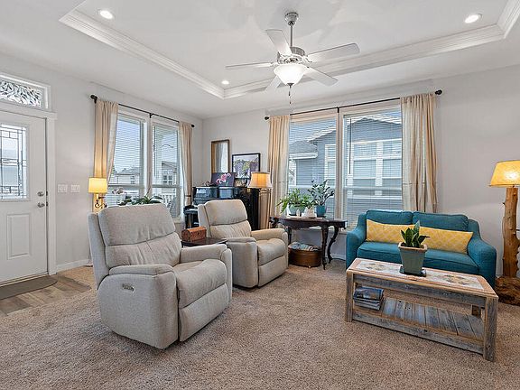 Welcome to this lovely home in the 55+ Cascade Village. This 1,512 sq ft open floor plan is designed to maximize space and light. 9' ceilings throughout, large windows and coffered ceiling in the great room which includes the kitchen, with large pantry, dining room and living room. Primary suite (12'9''X12'9'') consists of a walk-in closet, and spacious bathroom with ample storage. Guest room (11'X13) includes mid-sized closet and a large window. The den (11'X13') is perfect for an office or guest room, sliding door leads out to the deck and fenced outdoor space. Outside offers a covered front porch and fenced backyard for privacy and pets. Upgrades include custom cabinets in the laundry room, side deck with stairs, closet shelving, insulated and heated garage with overhead storage. Community includes outdoor pool, exercise room. Clubhouse with a full kitchen, library, card room, billiards room, and social events. Space rent of $875/month includes snow removal and security patrols.