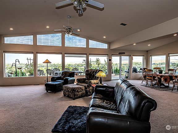 You'll be at the top of Milton Freewater in this unique, contemporary home. Expansive views from the great room opens onto a large deck with views that take in the city, mountains and valley. New vinyl plank flooring in dining area (carpet removed). Owner's suite is off the great room, and is complete with sitting area, ensuite bath, closet room and laundry. Great room features windows on three sides, propane fireplace and build-in bookshelves for cozy times at home. On the entry level, two bedrooms, office/media room and full bathroom. RV Hookup and parking. Minimal care yard.