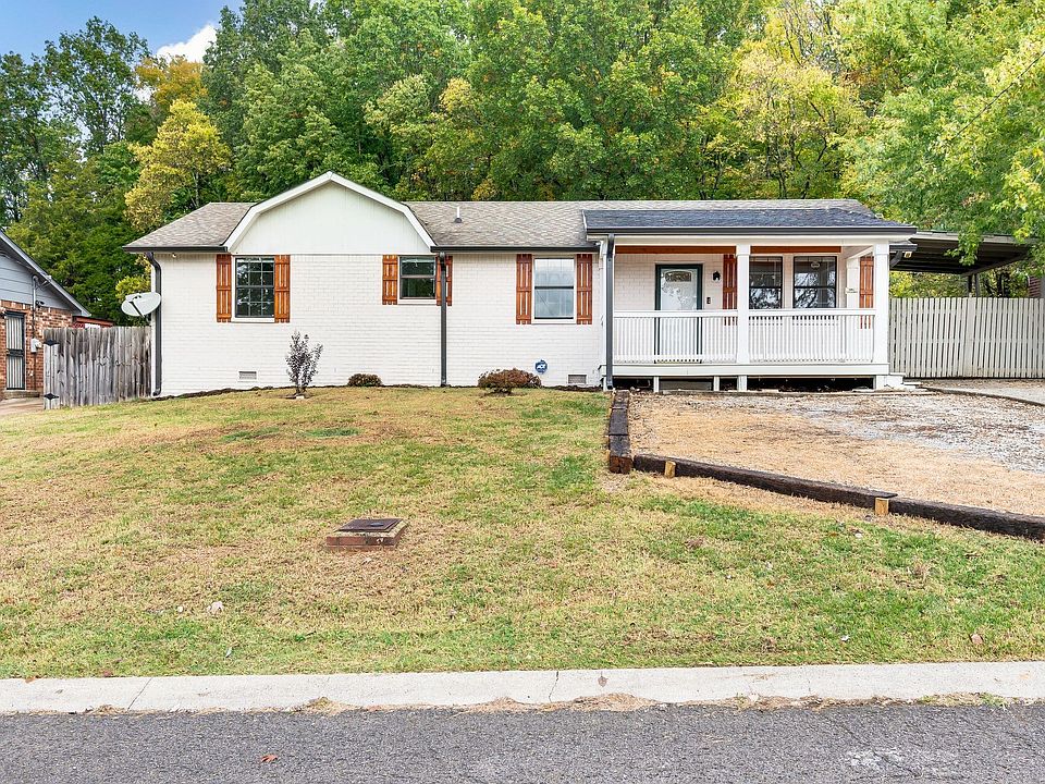 This Farmhouse inspired painted white brick exterior with warm wood accents and a welcoming covered front porch. The home features an attached privacy fence and gated carport offering seclusion and convenience from the side entrance. A large shed with an attached lean-to and additional gravel parking complements the concrete driveway. Situated on a fenced lot of over one-third acre, this fresh & bright home offers new luxury vinyl flooring in the bedrooms and bamboo flooring throughout the main living areas. The kitchen features a functional island peninsula providing extra countertop space, quartz countertops, and stainless steel appliances. The den can serve as a fourth bedroom for flexible living. Recent updates include HVAC (3 years), roof (12 years), windows (10 years), and water heater (9 years).
