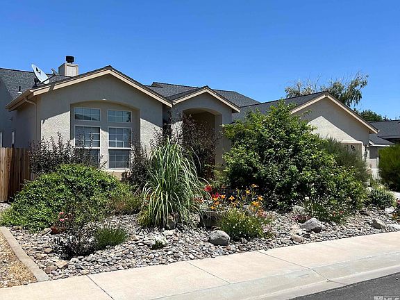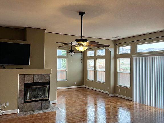 Beautiful home that shows pride of ownership with mountain views. Open floor plan with red oak hardwood flooring in kitchen, living room, formal dining room, and 2nd bedroom. New carpet in main bedroom. The kitchen has a solar tube in the ceiling, which brings in more natural lighting. Windows in the living room, dining room, front bedroom, and main bedroom have protective layers to shield against the sun. The kitchen has new stainless steel appliances, and a water softener system throughout the house., There are ceiling fans in the bedrooms, living room, dining room, and kitchen. T.V.'s in the living room and main bedroom stay. Both bathrooms tubs and showers have been updated with new tile. Front yard is low maintenance with beautiful perennial flowers and bushes, and the backyard is low maintenance as well with a large wood deck to enjoy the awesome Nevada blue sky's and lovely views.