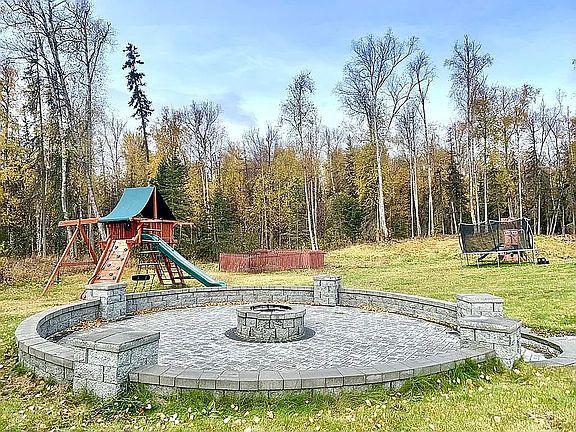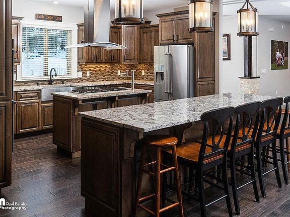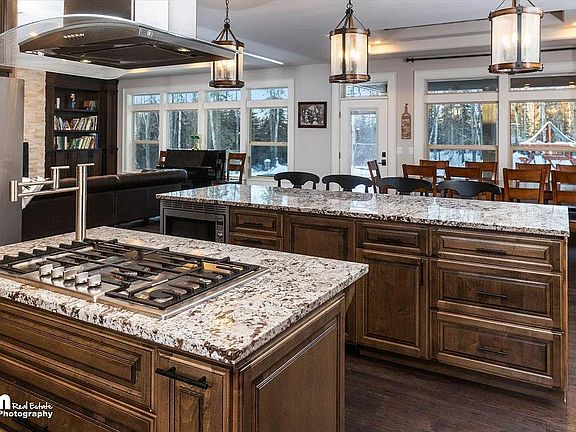 This beautiful, custom Alaskan oasis backs up to wooded land, sits on 2.57 acres with huge, grassy back, side and front yards on the end of a cul de sac. There is a gorgeous stone fire pit area in the back yard that connects to a large concrete, covered patio. The home has been tastefully crafted with the entertainer in mind with a large living room complete with a stunning wood fireplace, built-in shelving, tray ceilings, and tons of natural light. The kitchen has been carefully designed with double wall ovens, a gas range, an oversized island for seating additional guests, and a pantry large enough for all of your cooking gadgets and supplies. The large owner's suite has tray ceilings, an impressive master closet, double vanity, separate shower and soaking tub with custom tile throughout. The home features the master bedroom with 3 other bedrooms, a steam room, one and a half baths, and a laundry room on the main floor, with an additional bedroom on the second floor, as well as a second family room and an office complete with custom built-ins. The home has a good-sized lower level cold food storage room, a large shed, and an expansive 1,134 square foot garage and an oversized driveway with plenty of parking for RV's, trailers, and boats.