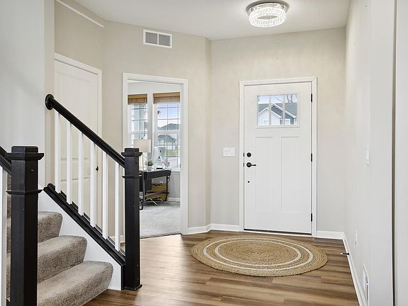 Welcome home to Bailey Woods and this stunning 2021 build. This desirable open layout offers quality craftsmanship and significant upgrades throughout, highlighted by 9' ceilings on the main & lower levels. Additional upgrades include south facing sunroom, hardwood laminate flooring, granite kitchen countertops, tiled backsplash, center island, and an upgraded stainless steel appliance package offering oven/microwave combo and gas stovetop. After working in the office, cozy up next to the gas fireplace in the living room. Upstairs you’ll find master bedroom with large walk-in closet with his & her sinks and walk-in shower. 2 additional guest beds, full bath with double sink vanity, loft and laundry room just down the hall. Unfinished basement with bathroom plumbing rough-in. Room to add a 5th bedroom and large family room. Premium corner lot. Conveniently located close to paths, parks, restaurants & shopping. Minutes to Hwy 10. Top Rated East Ridge High School in #833 School Dis!