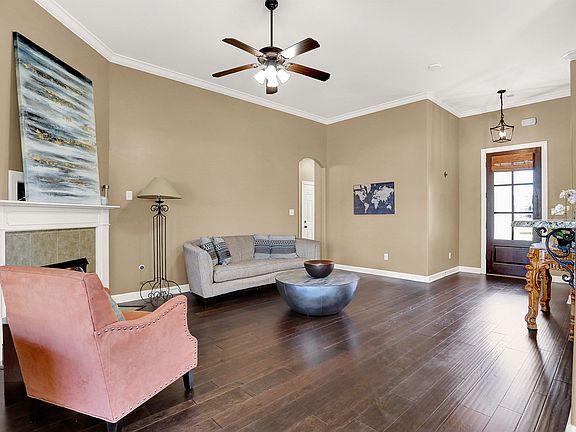 Awesome floorplan w/3 bdrms down plus one bdrm, a full bath & bonus up! All smooth ceilings; 11' tall in main living areas! Formal dining rm or office! Surround sound inside & out! Freshly painted interior, beautiful wood floors down. Kitchen w/granite counters, SS appls is open to great rm w/gaslog fireplace. All 3 full baths - tile floors & granite counters. Primary bath has WALKTHRU shower! Huge bonus leads to walk-in attic. Extended covered patio (22x15) w/large, level wood-fenced backyard.