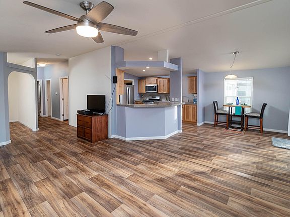 Welcome Home! Beautiful like new home in Bend's premier 55+ community. This lovely home features a large covered front deck. Inside boasts vaulted ceilings, sunlit great room wood laminate flooring and ceiling fan. Spacious kitchen with gas range, pantry and fridge as well as a breakfast bar. Large laundry room with sink and cabinets. Primary bedroom suite features 2 closets, dual sinks and walk in shower. Nice sized den/office and 2nd bedroom. Low maintenance yard with drip system. Backyard is ready for your finishing touches or leave as it is. Attached single car garage. This community includes, outdoor pool, fitness center, club house, pool table room, and much more. Space rent is 749.00 a month.