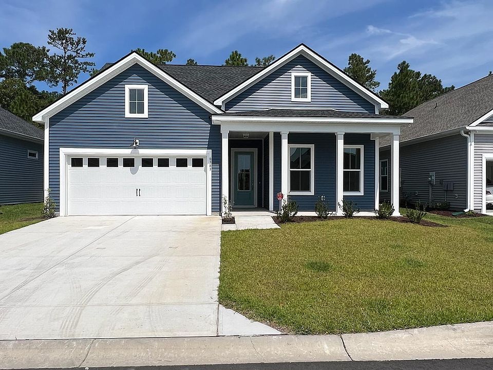 Note; this picture of home is not of actual home , it is being used for illustrative purposes only. see agent for exterior colors of home under construction. .This Wren Plan is under construction. Home offers 10 ft smooth ceilings, open kitchen, dining, family room, and sunroom. As you enter from your front entry into the wide foyer Revwood Laminate Flooring leads you through the main living areas to rear of the large sunroom . Carpet is in bedrooms. Beautiful open Kitchen with upgraded design options such as upgraded cabinets, kitchen tile backsplash , natural gas range, and more. Lots of windows on rear of family room and spacious sunroom. Primary Bath has relaxingly beautiful tiled shower walls, double sinks, tiled floor. Plenty of space in rear yard for entertaining, relaxing and pet to run around. A NATURAL GAS COMMUNITY. This home has gas heat and tankless water heater. Don't forget the security system and more upgrades than listed. Tucked conveniently a few miles away from Hwy 501 you have easy access to the beach, golf, shopping, Carolina Forest Elementary and High Schools, hospital, and restaurants. All of life’s conveniences are right around the corner. Plus, you can easily walk or bike to the Clear Pond clubhouse, 2 pools, fitness center, playground, volleyball, horseshoes, bocce ball and walking trail around large pond.