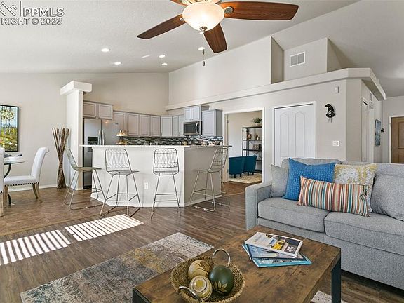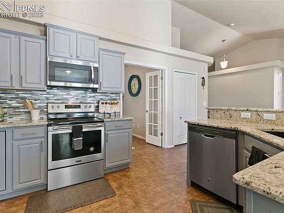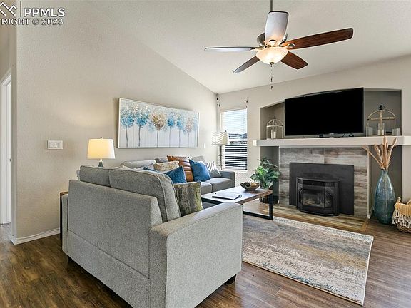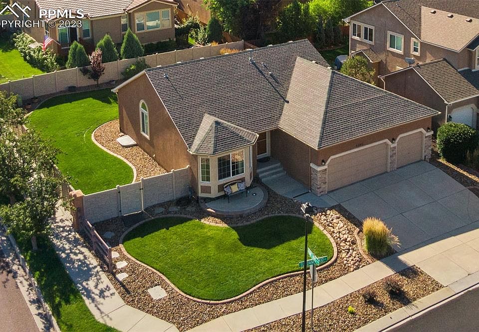 If you've been looking for the perfect 4-bedroom rancher with a finished basement and 3-car garage located on a beautiful corner lot in a great Colorado Springs neighborhood, then your search may be over. Designed and built by award-winning Campbell Homes, this phenomenal home has all the amenities you'd expect to find, and more. Expanded engineered hardwood flooring throughout the main level; great room with pellet fireplace and ceiling fan; open-concept, updated kitchen with granite countertops, custom backsplash, stainless steel appliances, and kitchen island breakfast bar; primary bedroom is bright and open with private en-suite bathroom hosting an oversized, tile-surround shower and walk-in closet; flex room right off kitchen makes for a great study or formal dining area; another bedroom, bathroom, and laundry space finish out the main level. In the finished basement you'll find a large rec room plumbed for a future wet bar, two bedrooms with a shared bathroom between them, and another flex space for your yoga studio, art room, or additional office space. Immaculate landscaping, storage sheds, private hot tub area, stucco exterior, AC, PEX manifold water system, 2022 hot water heater, 220 in garage, and the list goes on. Close to schools, parks, and the Powers Corridor where you'll find shopping, entertainment, and restaurants. Reach out to your real estate agent for more details and to schedule a private tour of this beautiful home.