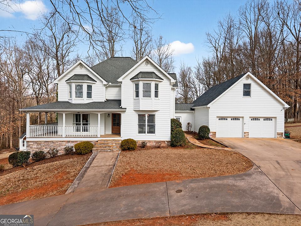 GET AWAY FROM IT ALL WITH GORGEOUS COUNTRYSIDE VIEWS FROM YOUR NEWLY RENOVATED FARMHOUSE. COMPLETE RENOVATION OF KITCHEN AND PRIMARY BATH. VIEWS OF YOUR PRIVATE POOL FROM THE MAIN LEVEL. THERE'S NOTHING LIKE HAVING A PARK IN YOUR OWN BACKYARD. THE BATTING CAGE, BASKETBALL COURT, AND SHED/PLAYHOUSE STAY! You are welcome to your new home with a wrap-around porch. Enter the foyer to find newly refinished hardwood floors and updated lighting. To your right, you'll find a stunning kitchen with new cabinetry, Quartz counters, an 11' double island, and commercial-grade appliances, including a gas range, dishwasher, pot filler, beverage fridge, and microwave. The remodel included a brick backsplash and brick walls in the breakfast nook to add character to an already charming home. The large dining area holds an 80" round table, perfect for conversation. The family room has a re-inspired fireplace with glass doors. There is a bedroom and a half bath on the main floor that can easily be converted to a full bath. Upstairs you'll find four bedrooms and three baths. The primary bedroom has a sitting area and extra closet. The primary bath has been completely reimagined to include new vanities, tile, a freestanding tub, an expansive shower, new lighting and fixtures. There is another large closet off this bathroom. There are two additional bedrooms and a full bath in this section of the home. Over the garage, you'll find a great teen suite or in-law/ guest suite with a huge bedroom and a renovated full bath. The upstairs has all-new carpet. The terrace level is partially finished and ready for a media room or game room. There is a 3rd garage door here as well. Walk out from the main level to a stone patio and an in-ground heated pool with a new liner. A fire pit awaits you for these chilly nights. You'll find room to roam on both sides of the home. Plenty of room for gardening, chickens, soccer, or whatever you want. You'll feel miles away, but you are just a mile from the newly renovated Bennett Park that includes baseball/ softball fields, tennis courts, a football/lacrosse turf field, playgound and picnic pavilion. You are also just 5 minutes from Publix, other shopping, and dining. You'll enjoy top-rated Forsyth schools, nearby Lake Lanier, and an easy drive to the Dawsonville outlets or to Dahlonega for a mountain escape. Listed below appraisal and ready for you to call home!