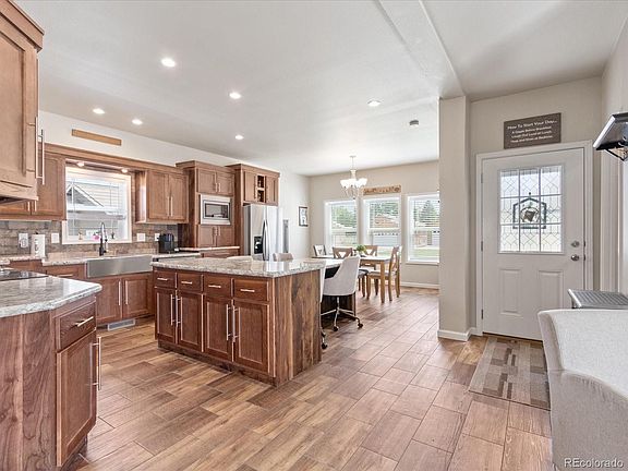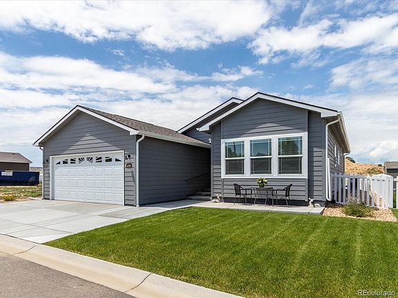Mount Evans Ranch Home with 3 Bedrooms and 2 Baths on Premium Lot. Built in 2021, this 1,490 square foot home offers the latest finish and many extras! The home faces the east for lots of soft, natural lighting. The open floor plan and high ceilings offer a spacious feel and, at the same time, the rich brown-tone finish and fireplace offers a cozy feeling. The kitchen is the heart of this home where you can gather around the large island or the dining room table. The Farm Sink, upgraded Chicago Brick Backsplash and Under Cabinet Lighting adds great ambiance. The living room Gas Fireplace is framed in stone. From the living room, access the large patio and partially fenced yard. Extend the retractable awning for a cool respite from the afternoon sun and enjoy the summer within the white picket fence of your private yard. The primary bath offers a HUGE walk-in shower and closet with built-in shelving. The hall bath has a tub/shower. So many extras – the driveway is over-sized, the garage is insulated and dry-walled. There is a mud sink and stacked washer & dryer in the laundry. A storm door protects the entry from the elements. Enjoy the outdoors on the large patios in front & back of the home. TV mount will stay with the home, as well as, the four comfy chairs surrounding the kitchen island. Easy commute to I-25 or Hwy-85. Shopping, restaurants, coffee, and gas all within minutes of this great location. Prairie Greens is a land lease community. The land lease currently has a monthly fee of $715 and includes lease of land, road maintenance, street snow removal, clubhouse, fitness center, outdoor pool, and playground/park (NO HOA FEE - just land lease fee).