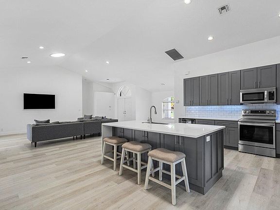 Owner will consider a Seasonal Furnished Rental ($7500/month).. Completely remodeled home that sits on an oversized .28 acre, waterfront lot... Fully custom open living space, great for the family & entertaining.. All 2300 sq ft of interior space were renovated in December 2021.. Custom kitchen w/ oversized quartz island, built-in cabinets, and LED color changing lights.. Water-proof vinyl plank flooring throughout.. Custom master bath, including a re-built walk-in shower w/ glass door, and a free-standing tub.. Custom vanities in both bathrooms.. All appliances were purchased and installed in December.. Brand new sprinkler system & pump installed in May.. The community pool, basketball & tennis courts, and playground area are just 5 houses down. Courtesy of Compass Florida, LLC. REF # 10824228