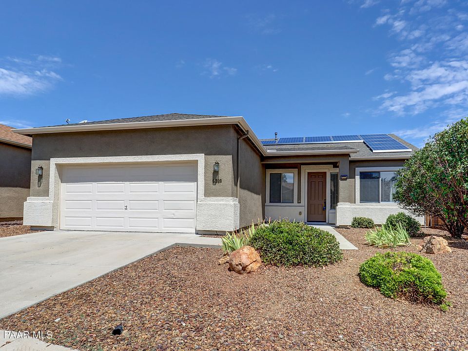 Granite Mountain and SF Peaks views! Lovely home in popular Granville-close to shops, restaurants, events! This 1,643 sf 3 bedroom, 2 bath 2 car garage home PLUS family room was built in 2005. It features new interior paint throughout. The kitchen includes wood cabinets, Silestone counters, gas range, refrigerator, with a breakfast bar at the island. Lovely dining nook with bay window is adjacent. There is a family room, and laundry with storage cabinets, and complete with washer and dryer. The Owners Suite includes dual sink vanity, separate garden tub and shower, and walk in closet. Outside you'll find a beautifully landscaped back yard with an extended patio and mature trees ready for relaxing and entertaining! Lots of Granville amenities-Clubhouse with pool, spa, fitness center, tennis