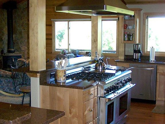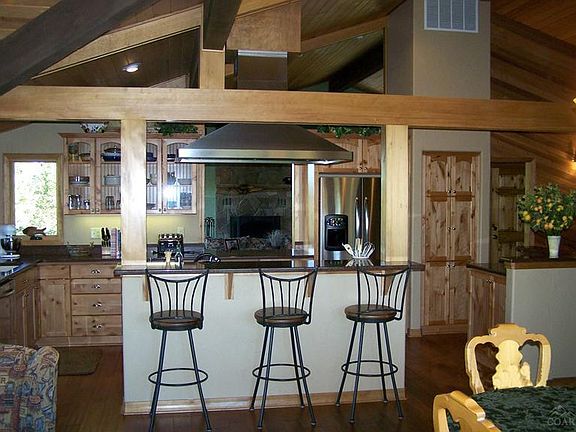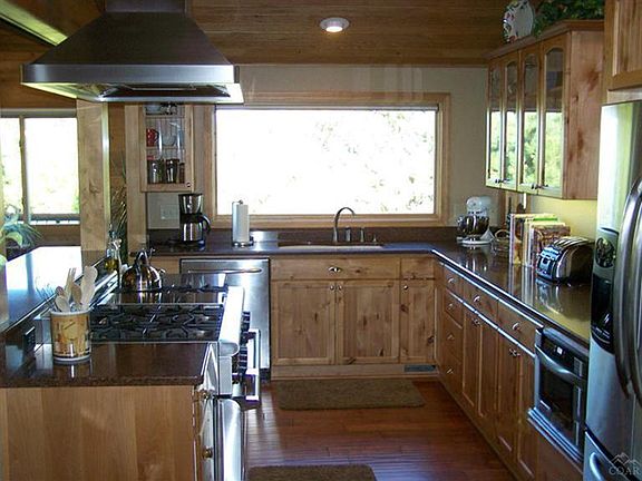 Cascade Mountain Views, Very private rustic home which has beautifully updated kitchen and master suite. Gourmet kitchen opens to cozy family room/dining area. Kitchen has informal bar seating. Great room on other side of kitchen with wood burning fireplace. Downstairs bonus/media room w/wet bar & propane fireplace. Beautiful flat lush lawn, 3 acres Swalley irrigation. 4-car tandem garage with shop area, plus 44' RV insulated garage. 6.18 pine treed acres. Big entertaining deck. A treat to show.