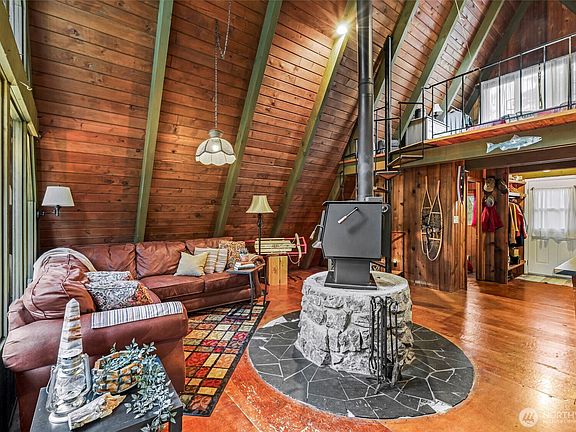 Classic A-frame cabin on a peaceful 0.7-acre lot near Mt. Baker—perfect for ski weekends or summer getaways. Soaring vaulted ceilings, exposed beams, and a full wall of windows fill the open great room with natural light. Cozy up around the Blaze King wood stove (new in 2023) or enjoy the outdoors on the large front and back decks. Covered cabana with built-in fire pit, wood shed, storage, and park-like setting with thoughtfully planted trees. One bedroom + full bath on main level, loft above. Ductless mini-split with A/C (installed 2024, 9+ year warranty), plus high-speed fiber internet. Minutes to Silver Lake, Nooksack River, and Baker Ski Area; fishing, swimming, kayaking, hiking. Full of original 70s charm—your mountain escape awaits!