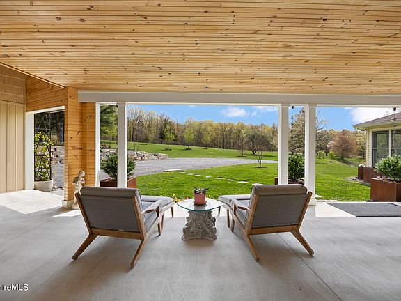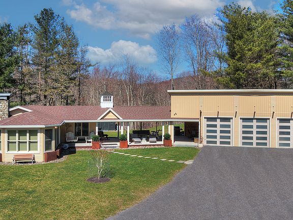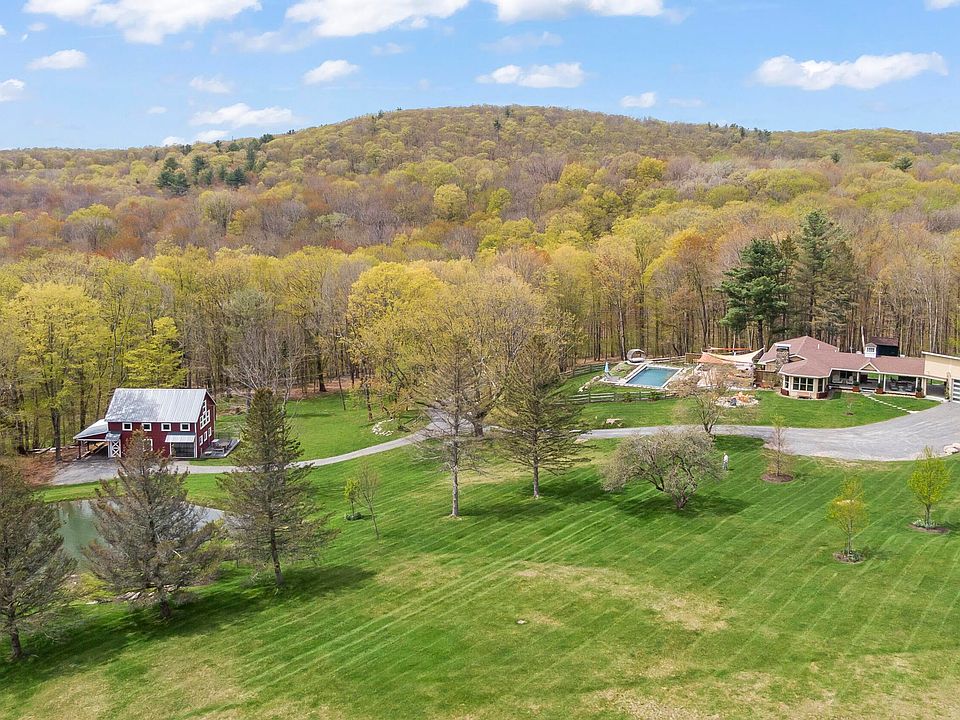 Amenities include Gunite lap pool, hot tub, outdoor shower, perennial gardens, gas and wood firepits, and 3 trails for exploration. Included in the 50 acres is 6 acres across the road, with a year-round stream.