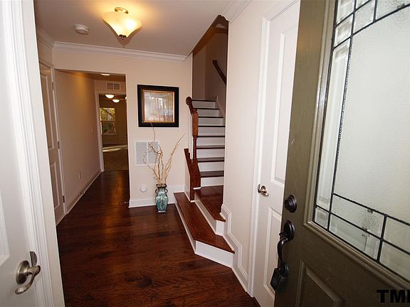 BRAND NEW, NEVER LIVED IN, END UNIT TH! 3 story floor plan. Huge Bonus/Den or 4th BR on 1st Flr. Kitchen/Living/Dining w/all hardwoods on 2nd Flr. French doors lead out to Deck overlooking wooded backdrop. All BRs w/two full baths on 3rd Flr. Gourmet Granite Kitchen with large center island with barstool overhang, stainless steel appliances, rich oversized cabinetry. Community pool, clubhse & tennis. Super-convenient locale close to shopping, 540 & RTP! Why wait for a new build? This one's ready now!