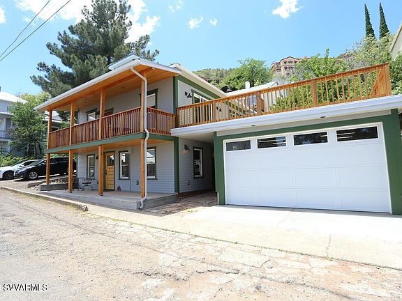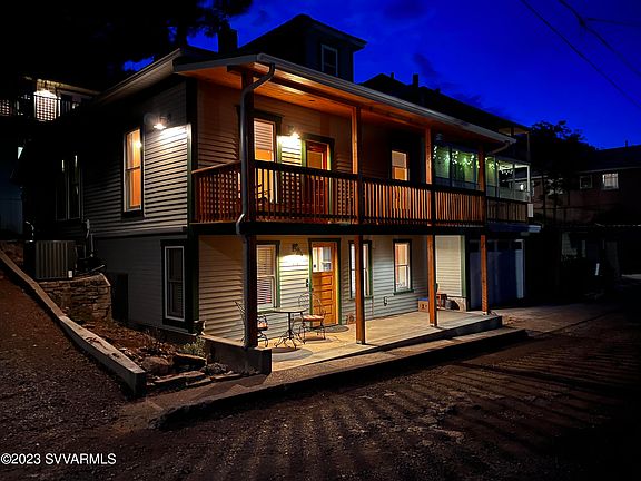 ONE OF THE OLDEST HOMES STILL STANDING IN JEROME, AND SHE'S BRAND NEW! From the ground up rebuild, everything (and I mean everything) is new, but looks old except for the wood floors and trim and 2 or 3 ripply wavy glass front windows- they are old. Rebuild was exquisitely done by our favorite local commercial contractor using, wherever possible, the old original boards and trim because they don't make boards like that anymore. When the Sellers bought this home and told me what they planned to do to fix her up I cautioned them that they either had to go full throttle or don't do it at all. They went full throttle. She's gorgeous, stable, way solid, and now a showpiece. Sale includes parcel #401-08-036A. (See ''More,'' for Seller's description of what they've done and what you get.) The downstairs is designed to be completely wheelchair friendly, with a front patio and living room and kitchen and Butler's pantry to die for. Downstairs bath is also wheelchair friendly, and you can roll right into the beautiful shower. Upstairs is another living room, the parlor, covered deck with views forever, the main bedroom with walk-in closet, second bedroom and hall bath and an office which could become a 3rd bedroom. Walk out from the parlor to the view deck above the 2-car garage. Wait! Did she say "2-CAR GARAGE? IN JEROME?" Yes, my loves, I did. You have a state-of-the-art 2-car garage with power and internet and everything. Out back you have a storage shed and the great-grandmother of all apricot trees that you share with 1 awesome neighbor. Here's what the Seller has done, in his own words: "Historic Jerome! Want to live in a Historic Jerome house, but you don't want to spend your days and nights fixing everything? This is a brand new 1900 house that has had everything rebuilt, replaced or restored. New massive foundation, new walls, new drywall, new electrical system, new plumbing, new bathrooms, new three zone heating system, new hardie board (concrete) siding and trim, new metal roof, etc, etc, etc. New, but it has the elegance and style of what the house was in 1900. Antique light fixtures and hardware throughout the house, new bathrooms with 1900's tile and 200 year old Douglas fir wood trim and floors throughout the house. It has also been recertified as historic with Arizona's historic organization (SHPO) and enjoys the advantage of very low taxes because of this certification. Keep the wavy glass front windows - that's how you keep the certification. House General features: House rebuild was designed by a professional architect and managed by a licensed commercial contractor. Both are available for discussions. New concrete and stem wall foundation under entire house. New walls were built throughout the house, new drywall, siding & insulation. New Metal Roof. Approx four hundred 1x12x10 foot boards were taken from the original house and reused to make trim and cabinetry. Hardie Board (Cement) siding and trim for no maintenance and fire / weather / insect resistance. 12" Douglas Fir Baseboards upstairs (boards removed from house and reused). 8" Douglas Fir BaseBoards downstairs. All window and doors trimmed with original Douglas Fir from house. Downstairs is ADA compliant and has 36" doors and clearances on a single level. Space under the stairs is sized for a single bed if needed to enable single level living. Antique doors and hardware add to the turn of the century ambiance. House was recertified as historic with the State Historic Preservation Office (SHPO) in 2022 and does not need to be renewed for 10 years. Easy walk to all the restaurants/shops/ and entertainment in Jerome. Heating: Two zone Mini Split heating/cooling system for downstairs, very efficient. Forced Air natural gas heating and air conditioning upstairs. Smart Ecobee thermostat. Plumbing: Recirculating Hot water system for instant hot water everywhere in house. New Water Heater. All plumbing in the house is new. Vintage style sinks and faucets. Insulation: All exterior walls are insulated, which results in very low heat/cooling bills: 2 year average of gas bills is $34 per month, and APS electricity averages $70 per month. Water, sewer, and trash are a combined flat monthly fee, starting at $77.74, depending on how many people live in the house. All interior walls and floors are insulated for sound isolation. Flooring: The original Douglas Fir flooring in entire house was preserved and refinished. Bathrooms: Both have historic small octagon tiles on the floor and subway tiles on the walls. Motion Activated foot lights in upper bathroom. Oversized insulated soaker tub in upper bathroom. Zero entry ADA shower in lower bathroom. Custom cabinet in upper bathroom was built from original house Douglas fir. Kitchen: Custom cabinets built from original house Douglas fir. Butler's pantry with copper sink and shelving made from original house Douglas Fir. Butlers pantry shelving has been sized for appliances such as microwave/coffer maker. Elkay Stainless Steel workstation/ sink system with cutting board, drying rack, lower rack. Custom under-cabinet LED lighting. Garage & Deck: New Two car garage - no issues with your parking! Garage deck with great views of Sedona/Clarkdale! Garage is built with oversized beams and extra supports for roof deck. Garage deck is an extremely durable multi-layer (4) epoxy and sand surface with a 25 year life. Redwood Garage Railing. Deck accessible from back yard or from upper living room patio door. Great spot for morning coffee or a party. Front Porches: Lower level porch with natural pine ceiling / two levels of lighting. Upper level porch has Hemlock (hardwood) flooring and Pine. Ceiling with multi level lighting. Great views of Sedona/Clarkdale! Electrical: 200 Amp service to the house. Each room has extra electrical plugs. Most rooms have two light sources, bright and subdued. Stair lighting comes on and off at Dusk/Dawn for safety. Electrical Subpanels in the Laundry room and Garage. Laund