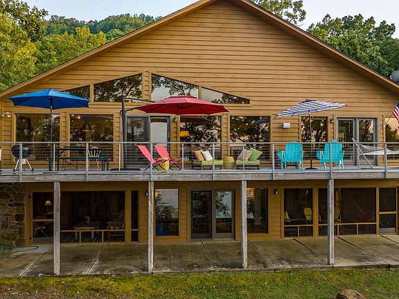 LAKEFRONT! LAKEVIEW! Huge windows! Luxury on "Big" water at pristine Greers Ferry Lake just east of "The Narrows and Bondair". Gated circle drive, warm, welcoming family lakehouse. A dream for entertaining & for lifetime family experiences! Split to rear the main level lives as a 1 level for owners with the primary suite, expansive primary bath, great room, oversized DR, inviting entry, gas starter WBFP, chef's kitchen w/ fantastic wrap around bar, powder room, utility room & a deep deck that spans the width of the home. The lower level is a guest's dream with 2 large ensuite bedrooms & custom full twin sized built-in bunks, a second super spacious living room, a kitchenette & 2 incredible screened porch lanai's with full size outdoor daybeds. Deep, attached 2 car garage. The property offers a fully fenced backyard, a wide concrete path for side-by-side access to the beach, tritoon beach parking, a deeper water anchor for surf boats, and a front yard fire pit and rock creek, all ideal for dreamy nights by a cozy fire underneath the stars! Lacey's Marina is a 5 min ride by boat and about 10 mins by car offering convenient and easy boat housing. NEVER RENTED but VRBO turnkey ready.