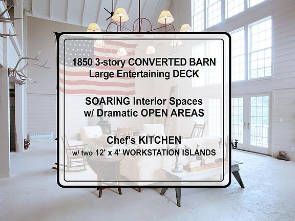 1850 3-story CONVERTED BARN -- 3D TOUR AVAILABLE. A POST AND BEAM MASTERPIECE on 17.89 acres with 3 separate lots, SOARING INTERIOR SPACES, many DRAMATIC OPEN AREAS, 4 huge BEDROOMS - plus cathedral ceiling MASTER BEDROOM and bath . . . and an OPEN CHEF'S KITCHEN with two 12 x 4 PREP/COOKING Corian countertop ISLANDS. First Level: KITCHEN w/two 12x4 WORKSTATION ISLANDS and 2 integrated sinks, gas stove, French door refrigerator, wine refrigerator, dishwasher and extensive cabinetry/shelving. OPEN GATHERING ROOM w/dramatic 3-story paned-window feature, wood stove, open DINING AREA . . . and French doors to large ENTERTAINING DECK. Two BEDROOMS and bath with soaking tub/shower combo. Second Level: Cathedral ceiling MASTER BEDROOM w/a 2-storied multi-paned window feature and built-in closet/cubical storage wall unit. MASTER BATH w/large 2-person walk-in SHOWER ROOM, 2 Kohler pedestal sinks and dramatic custom stone-tile floor. Open CONVERSATION/GATHERING LANDING AREA w/original barnwood accent wall. Two BEDROOMS and bath with soaking tub/shower combo. Entrance Level: Heated MUDROOM EXTENSION w/built-in storage-seating units, heated ENTRANCE HALLWAY to 2nd level GATHERING ROOM, 2-car tandem GARAGE . . . and WOOD/WORKSHOP with ceiling heat unit. Many additional features . . . including: Exposed original rustic hand-hewn beams, beadboard interior walls, industrial-style overhead lighting, original restored stone walls, stone patio walkways, pond and stream.