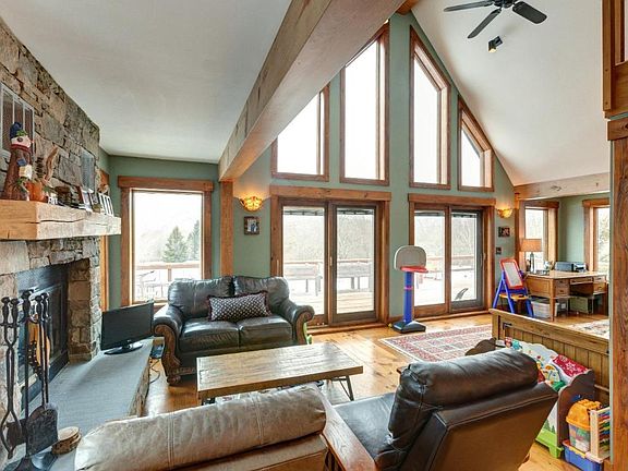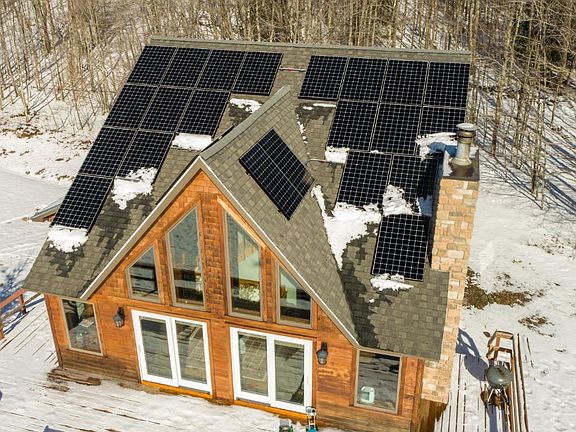 HERE COMES THE SUN! Sundrenched contemporary chalet on 5 glorious acres with breathtaking views of Belleayre Ski Mountain. The main floor offers cathedral ceilings, and a wood burning fireplace. The kitchen has soapstone countertops, and separate dining area. The second floor offers two bedrooms and a full bath. On the lower level is a one car garage and a large nearly finished space. This would be perfect for an additional bedroom and additional common space with a roughed plumbed half bath. Many upgrades, include but are not limited to; new siding, new roof, new windows, and new decking. Live green, 24 SOLAR PANELS and energy storage system. As an added bonus beautiful trails throughout the property.