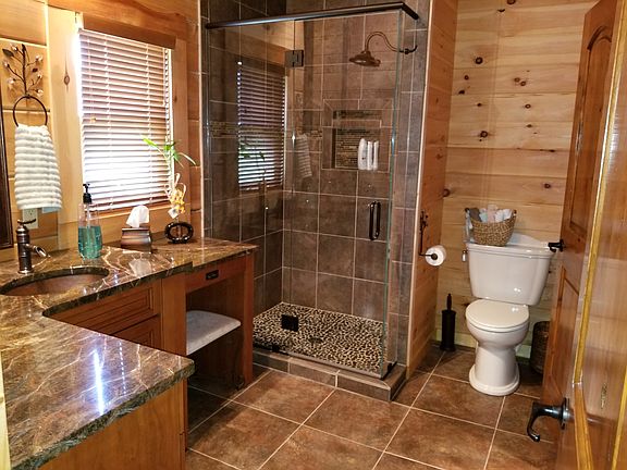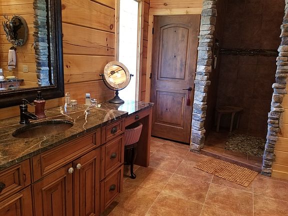 One-of-a-kind custom built log home nestled on a secluded 18 acre lot. 12" dovetail flat logs w/ tongue & groove knotty pine walls & ceilings. Custom cabinetry, lighting, doors, sinks, countertops & more! Upstairs bonus rm/mancave w/ half-bath & custom bar. Extensive outdoor living space complete with wraparound decking, covered porches & patios, waterfall, and hot tub. 2BR guesthouse, detached 2 car garage, 2 car carport and a workshop! Generac stand alone generator. 1 AC, 12 ft deep stocked pond.