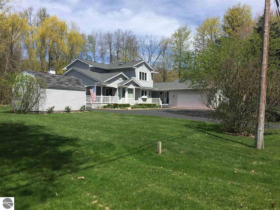Dream Home on Old Mission Peninsula! Ideal floor plan; Main floor Master Suite; lovely Fireplaces (2) in Living room (wood/brick surround) and in Den (gas/custom wood surround); Spacious rooms throughout; Foyer entry(7.08x10.08-wood); Bedroom #3 has a balcony overlooking backyard; skylights in both upper bedrooms; Views of East GT Bay; heated 2-car garage; Circle driveway; Manicured Landscaping; Deck #1 to backyard (19x14); Deck #2 to side yard (15x10); home has generator. Furnace is in crawl space-entry to crawl space is through Bilco double doors on exterior north side of home. Only 1 mile to Traverse City limits.