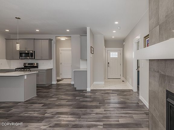 Like New! Built in 2019, this beautiful home has a lovely kitchen with quartz counters, SS appliances (all stay), soft close cabinets, farm sink, and pantry. Spacious living area with gas fireplace. Open, split floorplan provides privacy between primary and secondary bedrooms. Large primary en suite bathroom with huge walk in closet, separate tub w/ tile surround and tiled shower. (See Supplement)Second bath tub surround is also tiled. Large walk through coat closet between laundry and entry with space for Alaska's coats and shoes! Large garage with coated floor. Full acre lot with no houses directly behind you! Space cleared in backyard for future shop/shed, etc. Covered back porch. Gravel RV pad. Water filtration and softener. 6' tall crawl space! High tech security system. VA assumable loan with 2.75% interest.