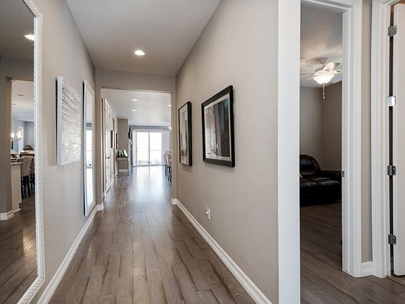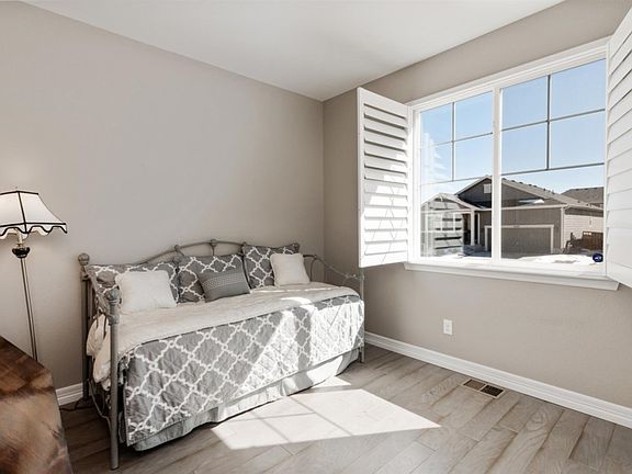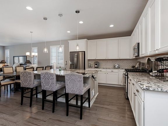 ** Like-New Ranch Style home in Cobblestone Ranch with 3 Beds and 2 Baths in 1,945 above ground square feet is not to be missed ** This stunning property is bright, open and full of high-end options and lovely decorative selections such as, white cabinets, granite and quartz countertops, wood floors, 9 foot ceilings, 8 foot doors and plantation shutters throughout ** The main living space is a light-filled great room with the kitchen, dining area and living room seamlessly flowing together ** The kitchen has loads of storage and counter space for meal preparation, with stainless appliances, an island with room for seating and pendant lights, and a pantry ** The dining area has plenty of space for a comfortable table and is accented by the ceiling fixture ** In the living room, one can relax and enjoy the fireplace with the wall-mounted television above it, or choose to step out the sliding door to the deck ** The primary bedroom has a well-appointed ensuite bath including the huge walk-in closet, a white vanity with dual sinks and an over-sized walk-in shower ** The secondary bedrooms are adjacent to the second bath and could be great for guests or to use as an office ** The unfinished basement offers another 1,945 square feet to use as you see fit, with tall ceilings and large windows, each with a window well cover ** Xeriscaping on the front and back yards, with a drip system in place, require less maintenance ** The fully fenced back yard has a composite deck and room for a grill, dine or entertain **