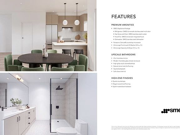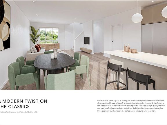 Spacious three-bedroom townhomesClassic farmhouse-inspired architectureClean black-and-white exteriorsWarm modern interiorsFinished with soft woodsNeutral paletteLuxurious smeg appliance package