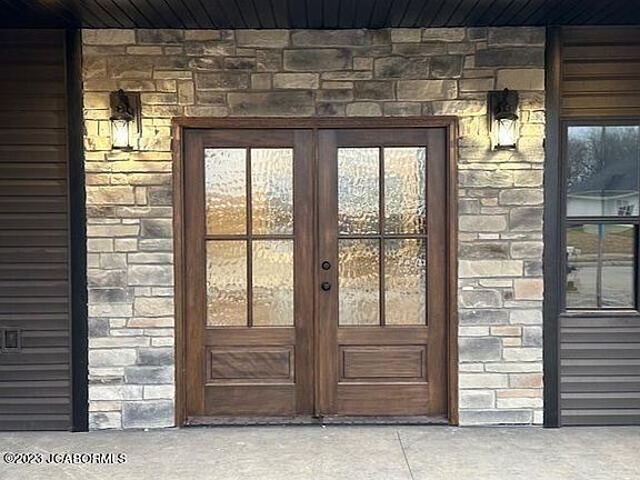 - Description: Trayed ceiling, stone-surrounded gas fireplace