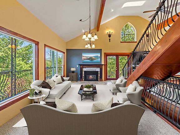 Welcome to this exquisite Mediterranean-style home in a private, gated community. The main level features a spacious living room with a cozy fireplace, a gourmet kitchen, sunny breakfast area and a primary bedroom with walk in closet and marble bathroom, and its own fireplace for added warmth. A versatile loft with hidden storage closets, extends between the living room and kitchen. The lower level includes a stylish wet bar, a bonus area ideal for a family room or entertainment space, two additional bedrooms, a full bathroom with laundry facilities, plus direct exterior access. This home will delight with its character and architectural interest. Outdoor features include a stunning front deck that wraps around the side, perfect for enjoying the serene surroundings and gorgeous views. The mostly sloped 1.94 acre terrain provides seclusion. This exceptional property offers luxury & seclusion in a picturesque setting. Don't miss the chance to make this Mediterranean-style gem your own!