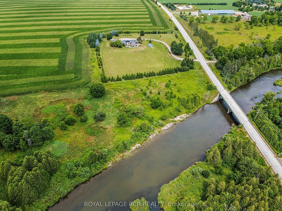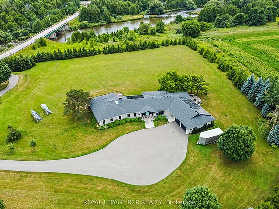 A winding driveway draws you toward The Riverlands, a spectacular top-of-the-line modern estate offering over 7,000 sq ft of total space. Nestled on 3.67 acres with commanding views of the Grand River, this architectural gem underwent an extraordinary full-scale renovation from '20 to '22. Today, it stands as a seamless fusion of timeless design and forward-thinking sustainability, boasting carbon-neutral, net-zero-ready systems. The main level features a stunning chef-inspired kitchen with quartz countertops, custom cabinetry, and an impressive suite of appliances. Sliding doors lead to a stone patio with a fireplace and BBQ, perfectly positioned to enjoy the sights and sounds of one of Ontario's premier fly fishing destinations. The open-concept living and dining area is enhanced by natural light, bespoke walnut built-ins, and sweeping river views. The primary suite is a private retreat, complete with a five-piece ensuite, custom dressing room with integrated laundry, and access to a versatile den or office with a wood-burning fireplace and access to the rooftop terrace. Two more bedrooms offer walk-in closets and share a beautifully updated bath. A curved staircase leads to the lower level featuring a second kitchen with an indoor charcoal grill, a family room with fireplace, a billiards room, a guest suite, a wine room, and a walk-in fridge. Thoughtfully designed to function seamlessly as a multi-generational home, this level offers independent yet connected living spaces ideal for extended family or guests. The showstopping indoor saltwater pool has dedicated HVAC and solar-powered heating, plus a sauna, change room, and adjoining sunroom with walkout to the backyard. Rooftop solar panels, geothermal systems, upgraded electrical, smart home features, and plans for a detached 3-car garage complete this one-of-a-kind package. Just minutes from Belwood Lake and downtown Elora, The Riverlands is a rare blend of modern luxury, natural beauty, and sustainable living.
