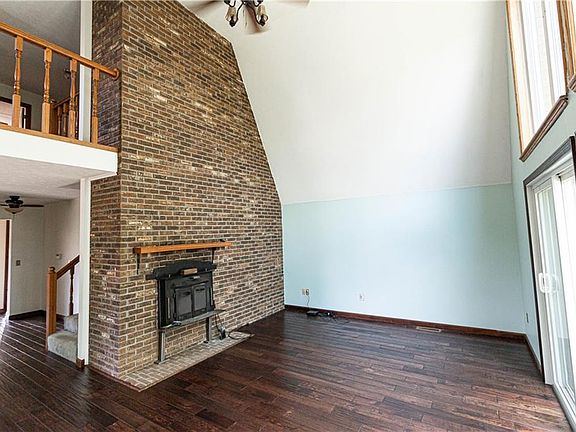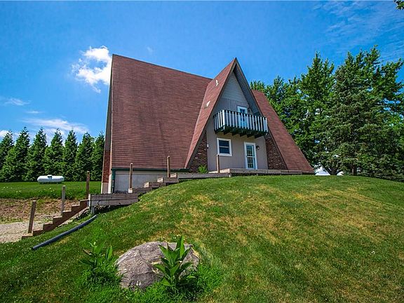 This A-frame home is absolutely stunning! Nestled on 3 acres with mature trees and a long drive, this home features 3 bedrooms, 2 full baths, a 2 car attached garage, and a full unfinished basement. Step inside and you'll immediately fall in love with this homes open floor plan, high ceilings, gorgeous hardwood floors throughout, beautiful brick wall with fireplace, and the large windows allowing lots of natural light! Kitchen features new appliances, countertop, and cabinets. 2 bedrooms and 1 spacious full bath are located on the first floor. Family room is perfect for gatherings! From here, head through the sliding glass doors that take you out on the deck. Another bedroom and full bath are located upstairs. Access to the walkout balcony also located on second level, where you'll enjoy the natural scenery. Schedule your private showing TODAY! This is a must see!!!