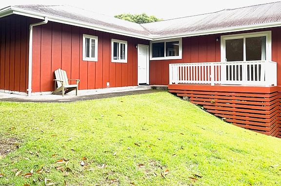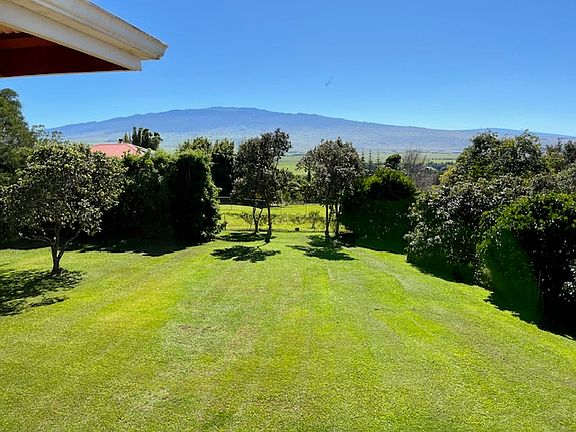 Spacious 3 bedroom, 2.5 bath home for rent in quiet, family friendly neighborhood. Bamboo flooring throughout the house. Attached, enclosed 2 car garage with large storage room. Master bedroom includes large walk-in closet and private bathroom. Additional bedrooms have large closets and share a full bathroom. Kitchen fully equipped with stove, refrigerator, dishwasher, garbage disposal and pantry, as well as plenty of cupboard space. Laundry room is also fully equipped with washer, dryer, and 1/2 bathroom. Living/dining room furnished with leather sofa, love seat and arm chair, coffee table, recliner and large dining room table. Television room contains flat screen TV. House is wired for Spectrum internet. Sits on one acre yard with large Koa shade trees, as well as flower bed. Property has spectacular views of Mauna Kea and Mauna Loa. Located less than 5 minutes from schools, shopping, hospital. Pets considered with Pet Deposit and Pet Addendum. Water/Electricity/Yard Service included. Attached studio (with separate entrance and appliances) not included. 6 month lease.