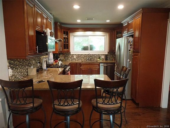 Beautifully updated four bedroom Ranch home, in the North End. This home features an open floor plan with hardwood flooring through-out. Spacious kitchen with breakfast nook, granite counter tops, tile back-splash, LG stainless steel appliances, recessed lighting and crown molding through out. Dining area directly off the kitchen. Bright living room with a stone faced fireplace, crown molding and recessed lighting. Large master bedroom with private full master bath.Three generously sized bedrooms. The private backyard has a paver patio with built-in stone fire pit, great for entertaining. New roof (replaced 10/18) newer vinyl windows, furnace and central air system. Walk out basement with fire place, can be easily finished. Conveniently located to SHU, Merritt parkway and shopping.